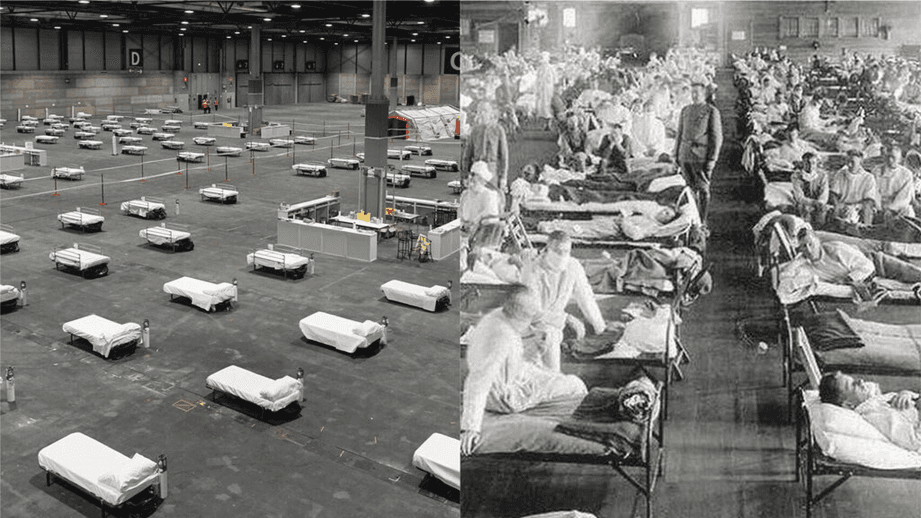 Hospital de campaña en España por el coronavirus hoy, y en Kansas en 1918 por la gripe española.