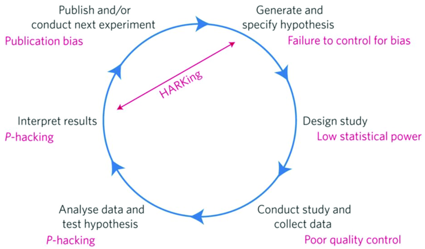 HARKing. Este es un acrónimo de “Hypothesizing After the Results are Known”. Presentar hipótesis post-hoc, en la introducción de un estudio, como si hubieran sido formuladas antes de obtener los datos. Mientras que p-hacking, trata de que los datos conformen la hipótesis, HARKing simplemente busca una hipótesis, que vaya bien con los datos.