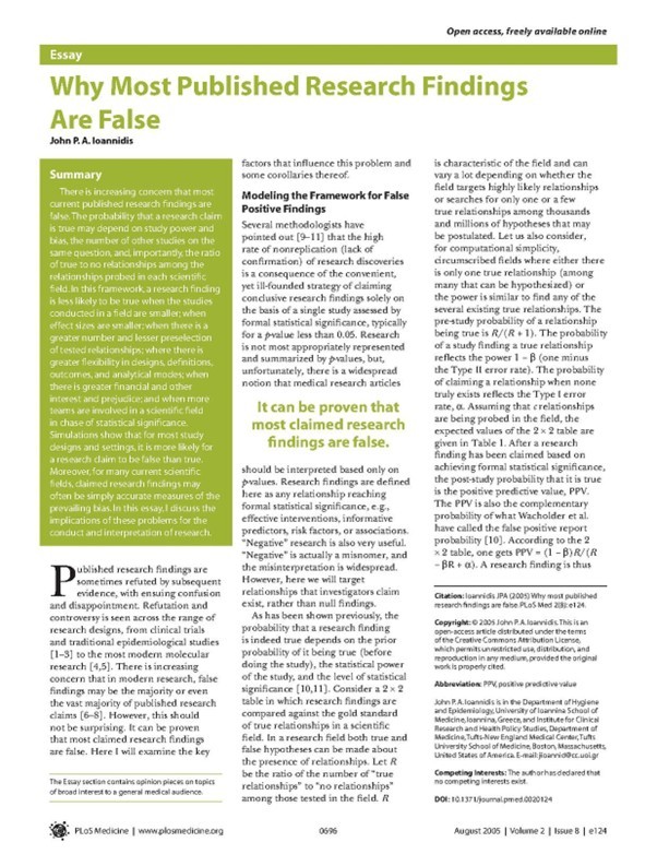 Uno de los trabajos más citados en la literatura científica, es el de John Ioannidis, que lleva el título: “Why Most Published Research Findings Are False”. (Ioannidis JP, 2005) (6)
