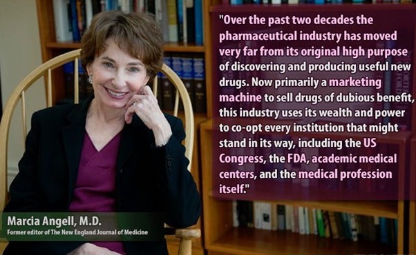 “…las ganancias combinadas de las 10 mayores compañías farmacéuticas (35.9 billones, 2002) fueron mayores que las de otras 490 empresas combinadas (33.7). En las últimas décadas la industria farmacéutica se ha alejado del propósito de producir drogas útiles. Hoy es una máquina de marketing, para promover el uso de drogas de beneficio dudoso. Esta industria usa su riqueza y poder para cooptar todas las instituciones que están en su camino, el Congreso, la FDA, la academia y los profesionales que escriben las recetas.”(Marcia Angell, 2009) (32)
