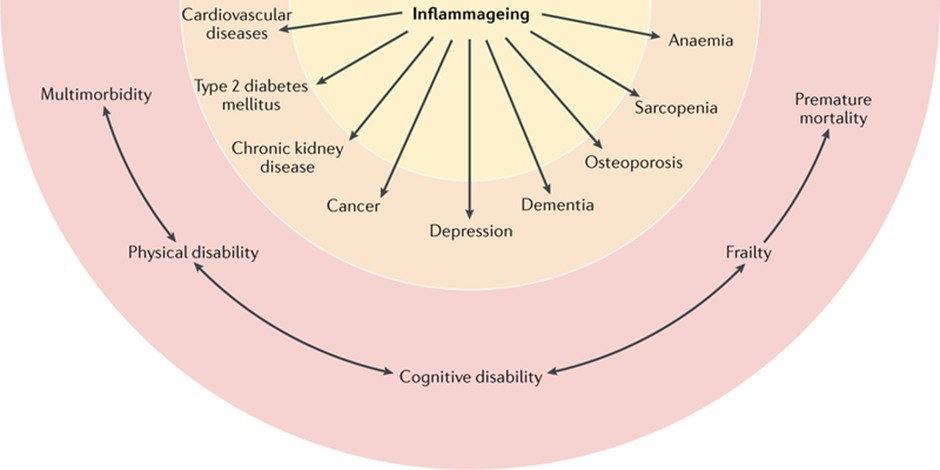 Los estudios epidemiologicos han demostrado que inflammaging es un factor de riesgo fundamental en la enfermedad cardiovascular, el cáncer, la enfermedad renal crónica, la demencia, la depresión y otras. Además, es un indicador de mala salud, perdida de agilidad y fuerzas, la llamada fragilidad del anciano, que lleva a la muerte prematura. Es uno de los pilares de la biología del envejecimiento. (Ferrucci L, Fabbri E., 2018) (3)