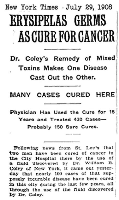 William Coley, un cirujano del New York City Memorial Hospital, (ahora Memorial Sloan-Kettering Cancer Center), observó que algunos pacientes operados de tumores que desarrollaban erisipela, evolucionaban favorablemente. Pudo observar también algunas curaciones espontáneas, de tumores inoperables que ante estas infecciones sufrían regresión total.