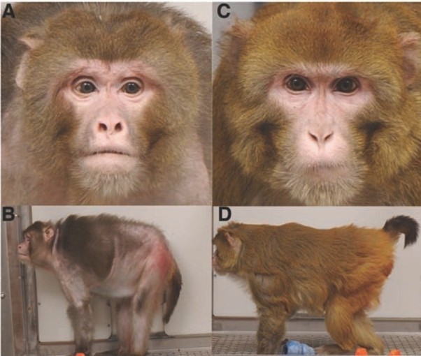 La experiencia de restricción calórica, en monos Rhesus. A y B, comieron libremente. C y D restricción de calorías. Fotografiados a los 27 años, límite de vida en estos animales. (Universidad de Wisconsin)