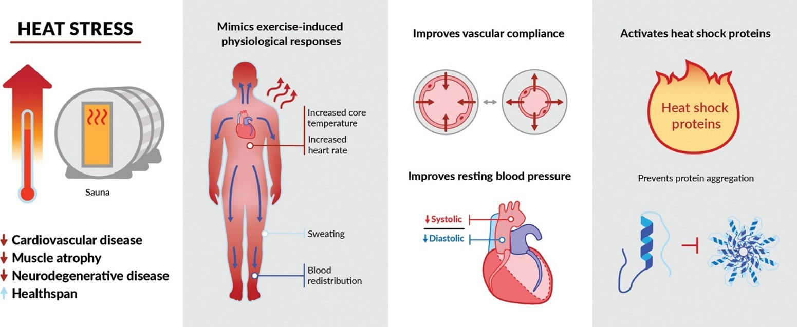 Efectos de la sauna. Tomado de: Patrick RP, Johnson TL., Sauna use as a lifestyle practice to extend Healthspan. Exp Gerontol. (2021).