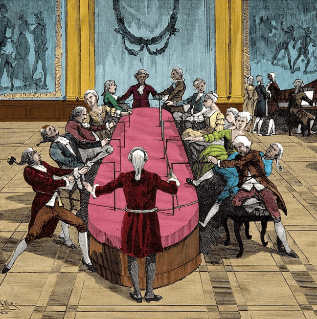 Franz Mesmer conduce una sesión de terapia. Los enfermos sentados en torno a un gran “baquet”, recipiente lleno de "agua magnetizada". Varillas metálicas salen del mismo. Su contacto cura. Wikimedia Commons.