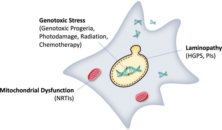 La senescencia se asocia con las progerias. La progeria de Hutchinson-Gilford (HGPS), se caracteriza por un envejecimiento prematuro que comienza en la infancia. La HGPS es causada por una mutación en el gen LMNA, que produce una proteína defectuosa llamada progerina. La progerina provoca daños en el ADN y disfunción nuclear, lo que induce un estado de senescencia celular prematura. En tejidos de pacientes con HGPS, se observa una acumulación significativa de estas células, especialmente en tejidos como la piel y el sistema vascular.