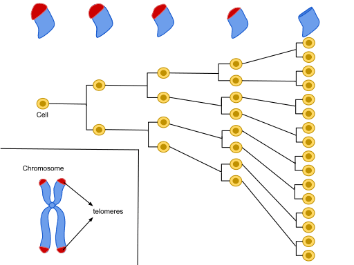 En cada división celular se pierden partes del telómero. Se alcanza el límite de Hayflick, y se detiene el ciclo, la célula sigue viva, pero quiescente. El acortamiento de los telómeros es la marca de la senescencia replicativa.